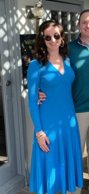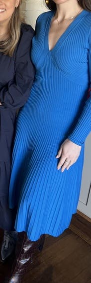 I looovvveeee this color. It’s a beautiful bright blue and super flattering. The material of the dress is quite heavy - definitely a dress for colder weather. I will agree that the dress is super unforgiving so be prepared to wear spanx underneath if that worries you.