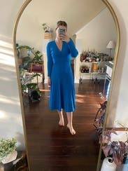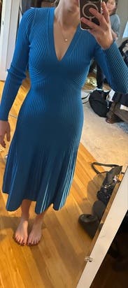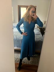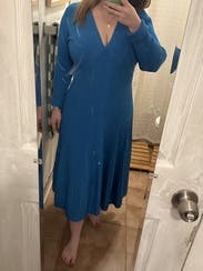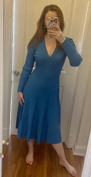 I had rented this to wear to a conference for work but did not end up attending. Instead I wore this for some video calls because I work from home. It looked great on camera - the color really popped. I highly recommend this dress - the color is gorgeous, the cut is flattering, and the fabric is thick and high quality but not in a way that makes you look bulky (as sweater dresses sometimes do). That said, I’m 5’2” and the sleeves were very long on me - I rolled them two or three times so they’d hit at my wrists. There was also some extra material in the armpit/shoulder area. Not sure if this was due to my height or more because so because I have narrow shoulders and a large bust - either way, it wasn’t a *perfect* fit which is why I only gave this four stars. UNDERGARMENTS Bra - I was able to wear a regular bra with this dress. The material is thick enough that you should be able to get away with wearing an unlined bra if that’s your preference. Underwear - Same note as above - the material is thick enough you shouldn’t have to worry about panty lines, though seamless is probably best. Shapewear - while this dress is very flattering on it’s own, I wore this with Spanx shorts because I’m very curvy in the hips/butt and felt more confident that way.