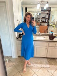 I wore this blue dress to work, out to dinner with friends, and at a work conference. I got SO many compliments. The color is vibrant and fun. The fabric is just thick enough to hide the lines you want hidden. Comfort forward and fashionable!