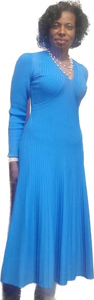 Blue knit (72% Rayon, 27% Nylon, 1% Spandex). A-line. V-neck. Long sleeves. Pull on. 50" from shoulder to hemline. Imported.