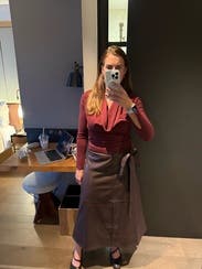 Really loving this top for fall. Great color, nice weight. Pairs well with Tonya Taylor skirt from RTR. I saw other reviews that it was low cut, but I haven’t had a problem. The cowl neck hangs down low, but still have full coverage where it matters.