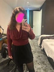 This is a clingy shirt with an OK cut. It might work better for someone very curvy or very willowy, but maybe less so in between. I like the burgundy color and almost bell sleeve. The fabric is fine but not soft.