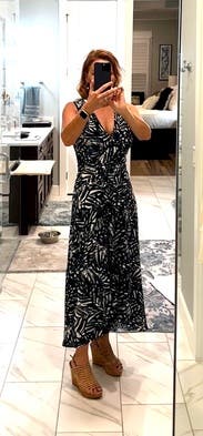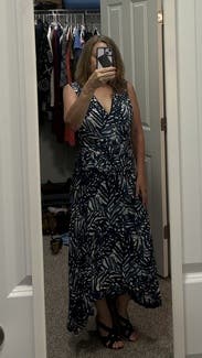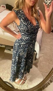 This dress is sultry, stylish, and confidence-boosting! It’s high-low with a gorgeous tropical leaf print that makes a statement. The fit is amazing….it hugs me in all the right places without being too tight. Super flattering and flowy at the bottom. I want to buy this!