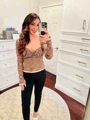 Loved this top to elevate a jeans outfit! Might not be the best for bigger chests im a 34B and it was ALMOST too revealing. Got lots of compliments just had to watch for nip slips