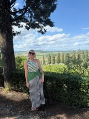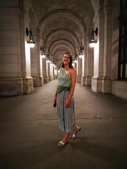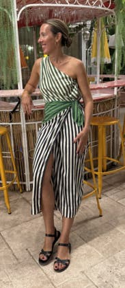 Words do not do this dress justice! It is SO fun. Multiple people thought it was separate pieces that I had coordinated. Note that the skirt is a wrap so when sitting, it can expose a lot of leg. Wore this to a winery but I think it would be perfect for vacation!