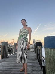 Simon Miller’s Belem Poplin Midi Dress bursts into the warm months with its one-shoulder design and bold mixed stripes, offering playful energy with every step. Pair it with tan slides and oversized sunnies for a vibrant, sunshine-ready statement.