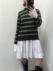 Multicolored brown stripe (30% Wool, 25% Viscose, 25% Polyester, 15% Nylon, 5% Cashmere, Lining 75% Cotton, 22% Nylon, 3% Elastane). Casual dress. Crew neck. Long sleeves. Pull on. Shoulder to hemline: 36". Imported.