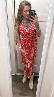 Red gingham (89% Polyester, 11% Spandex). Casual dress. Crew neck. Pull on. Sleeveless. Imported.