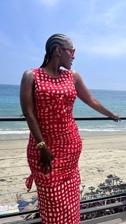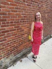 This summer dress is so cute for a party or picnic. It's fitted, but flattering. IG @bethielife