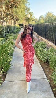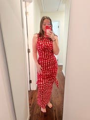 This was way more fun. I sized up to a Medium because I didn’t want the tie across the chest to be too tight. The ruching at the waist was a little loose so I’d say it’s TTS and I could have gone with the Small. I wasn’t sure what to do about shoes because it’s an awkward length for me at 5’2”, not a midi and not quite a maxi. The boots worked out perfectly. I’d def recommend this when you want to make a statement.