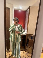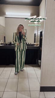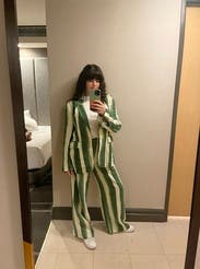 I got nonstop compliments while wearing these. I wore them traveling to a work dinner. They were plenty comfortable for a 2 hr flight. Pic was taken after the flight. They get slightly wrinkly but still looked put together. Got asked for the brand multiple times by women who wanted to get them. I’d buy them too if they weren’t so expensive! They’re such a statement I just feel like I wouldn’t wear often enough to justify, but perfect for rental. Wish I had rent r the blazer too (they were out of my size). These were slightly tight in the waist but loosened a bit while wearing. They were a bit too baggy on the hip/leg on me but I’m glad I sized up for the waist fit. I’m between an 8 and 10 and went with the 10 for these.