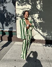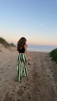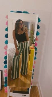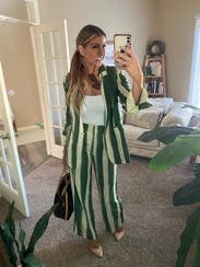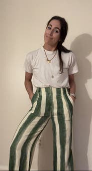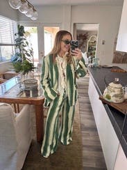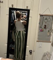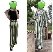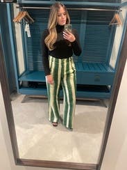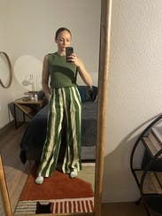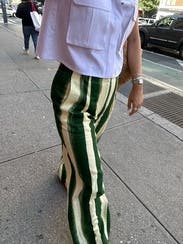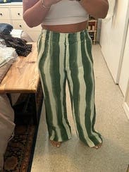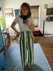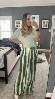 These look pretty tired on the hanger but are a total wow on! Very long so I pinned up the hem and that was perfect. The stripes and wide leg make me look taller. So comfortable. The lighter stripe is almost celery colored, not white, so I'm still experimenting with what tops it goes best with.