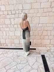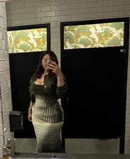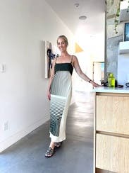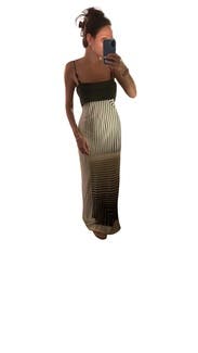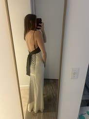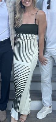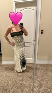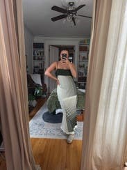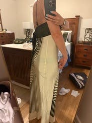 I was obsessed with this dress and kept it through several swaps looking for the right time to wear it. Until i finally did and caught it in the wrong light and realized you could see my belly button outline (a pet peeve of mine) and underwear line, even in seamless underwear. The dress isn’t tight and is lined, so i was really surprised by this and it made me nervous it was see thru. Outside of that it is beautiful and flattering. The color and print is perfect, more cream than white which i was pleased with and the with the green is a perfect combo. The top part that also ties in the back is unique and nice that it’s adjustable! I do wish the straps were adjustable too tho. When i tied to dress tighter, i felt like they dug into my shoulders. The dress definitely felt on the dressier side, especially with the full length. I wish it had been a midi to feel more casual as i did struggle finding somewhere to wear it. I’m 5’7 and felt at times that i was tripping over it in sandals, so probably not for anyone shorter unless you plan to wear heels!