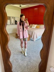 here’s the stitch- these shorts are closet mvps, so fun to style and they pack a huge punch. they’re much more green in real life. i have smaller legs, and love the way these fit me. would have bought them, but i fear ive overdone it on the cheetah in 2025, so trying to cool it off haha.