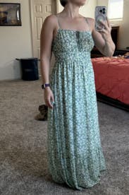 This was such a comfortable maxi. The elastic band was flattering for your figure but wasn’t too tight. It was also nice that the top seam was entirely elastic and the straps were adjustable. Overall this dress was great. May be a little long for the shorter gals I had to wear a platform to avoid it for dragging. Is lined so no worries if it being see through but didn’t cause it to be hot.