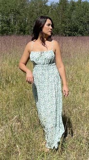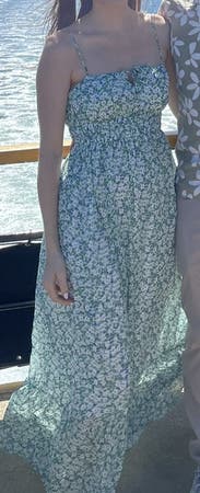 Super flowy, breathable dress, perfect for summer. I wore with wedge sandals and dress just about touched the ground so is on the longer side. Probably could’ve gotten away with a small as the top is stretchy, but have a larger chest and went with the medium and it was great!
