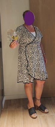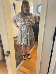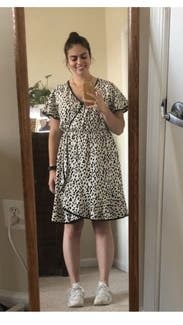 A simplified wrap style in a super flattering print. The color isn’t stark white which really elevated the dress. The quality is amazing. The only issue I had was the top was just too big but the rest fit just right. Nothing a pin couldn’t fix in the moment but overall it’s a one and done wear.