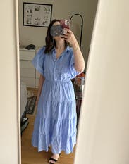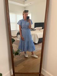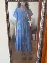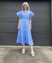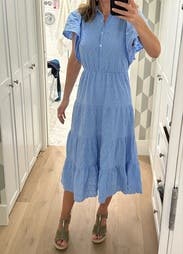 This dress was very flattering, although I should have gone up a size since I'm breastfeeding and the buttons pulled slightly in the chest. The flutter sleeves are cute but they do wrinkle easily, not enough to bother me though.