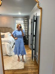 This one is great on. A lovely blue eyelet. Perfect for a summer event or the office as I wore it. TTS. Follow me on IG for more reviews: @annelw.