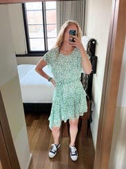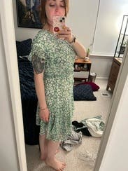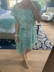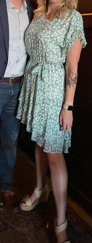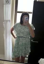 I actually only ended up wearing this once, but I loved it. The print, asymmetrical hem, and ruffles are way more than I would go for, but it just felt so pretty. A little bit up top, not enough to want to size down though as the skirt would have been too short. I was able to belt it a little tighter and felt comfortable. Definitely recommend!