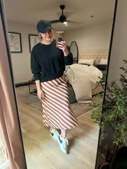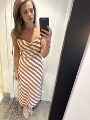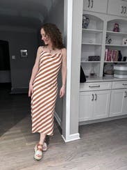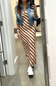 So many compliments! The diagonal stripes were everything and the copper and ivory was beautiful. This is a slip dress with not much give and no zipper. It fit me just right! I loved it.