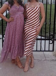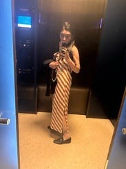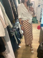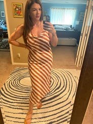 Fun party dress, silky and loved the copper on white striped print. Easy flattering fit and length. Not over the top but light and elegant. I'd rent again!
