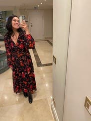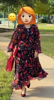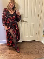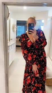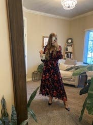 This dress is pretty, the colors in the print were perfect for fall/winter/holiday. I wore it to a holiday dinner with my girlfriends. I’m usually ok in an XS but found it pretty tough to close the bodice around my chest …. If you are busty you may need to size up. I also had to pin the top together for a bit more modesty, as it is a total plunge to the waistline otherwise and I wasn’t feeling quite that brave . Also wore nipple covers rather than a bra (a lot of bras will show with this deep neckline). It is not a sheer dress though so no issues with coverage otherwise. It is a little longer in the back than the front but I was able to wear relatively short heeled boots with it (1-2 inches). For reference, I’m a solid size C, 125 lbs, 5’2”. I don’t have a lot of experience with this brand but next time might size up to a small just in case. Would rent again.