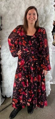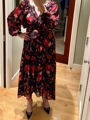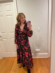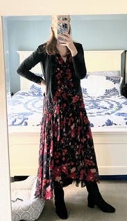 I wore this to an industry networking holiday lunch/party, and received so many compliments! I loved the fit of this dress - flowy and easy to accommodate/hide any extra weight around the middle. I felt stylish, and paired it with flat black boots - the hem hit just above the ground. I did wear a black tank underneath as the v in front was a little low for me.
