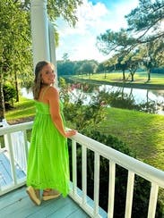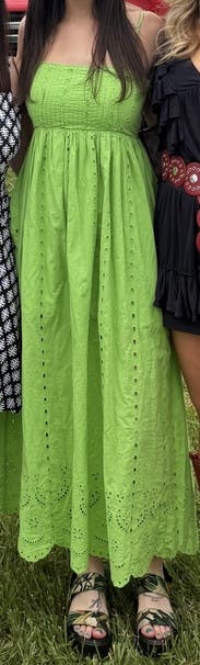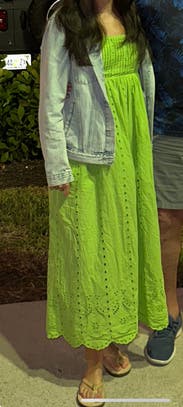 Very cute lime-colored sundress. Thicker fabric so lays nice. Fit great. Didn’t have to wear a bra. True to size.