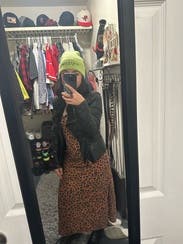 I wore this dress during the month of October and it was so perfect for the fall look I wanted and it fit so nicely and was actually comfortable. I was able to pull off not wearing a bra since there is a lot of fabric in the breast area and I think it hugs your curves nicely and gives enough space for big hips but doesn't hide my shape. I also like that it's not too long and is the perfect length since I am on the "shorter" size. Loved the leopard print and how good this dress made me feel!