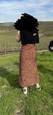 It’s Such a cute twist on the cheetah print. There’s a little dash of turquoise in the print. The dress is a very pretty rusty orangey brown. It is a flattering slip dress style and has a little bit of stretch. It’s a nice weight, so it lays smoothly on the body, but still lightweight enough to wear on a warm sunny day. XS fit me great and I didn’t need a bra!
