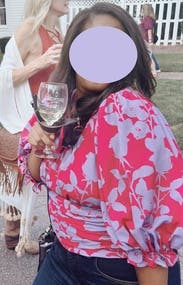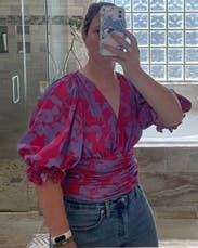 This top is flattering, especially if you have a smaller waist. I love the puff sleeves. The print is more vibrant than shows in the picture. The material is soft. I had to wear a tank underneath because it was a bit loose in the top. I would have been better sizing down to a small. It was a lot of fun.