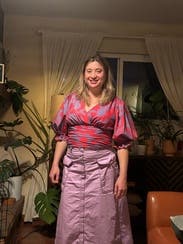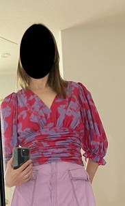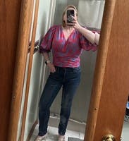 Cute, bright top. It is pretty cropped so needs a high waist skirt or pants unless you want to show your belly. The sleeves are pretty poofy, a little much for me, just out of my comfort zone in a good way. I liked wearing it under corduroy overalls.