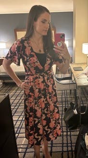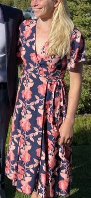 Although I did not end up wearing this dress for the event I rented it for, I would absolutely rent it again! It was incredibly flattering, the colors were so fun, and it was very comfortable! I would say it fit true to size, but if you are larger chested, you may need to wear a tank underneath, as it can be low cut from the wrap!