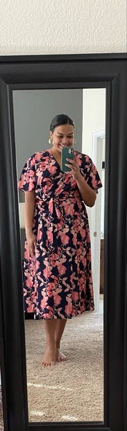 I loved this dress! Print was beautiful and bright; dress was not too low cut which is nice when sitting on zoom calls. It’s an actual wrap dress and it drapes beautifully. Midi length. Would rent again.