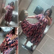 Great flowy midi dress. Dress is probably flexible for different sizes since it has a tie waist but probably not great for large chests since it is low cut. Definitely needed safety pins and double sided tape to keep the top from gaping open.