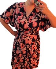 Wrap dress so adjustable. Flutter sleeves, and a-line are very flattering. Runs true to size/large for size with it being a wrap dress.