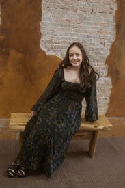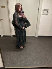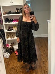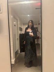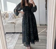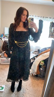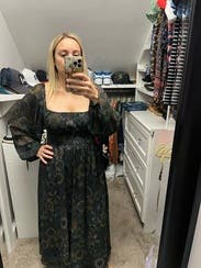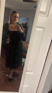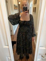 Loved wearing this dress for a holiday shoot with my pup. It fit perfectly and was super flattering in photos. Lots of give around the waist/stomach but still fitted. Loved the subtle green print !