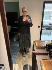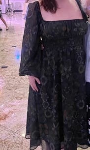 I ordered this dress for a friend’s wedding, which had a dark and moody autumn vibe. I typically wear a size 16 with a 44DD chest, so I ordered the XXL and the XL as a backup, not expecting the XL to fit. To my surprise, the XL fit perfectly, while the XXL was way too large. The dress itself is stunning, but the neck was a bit wide, and whenever I bent over, my strapless bra would peek out. I ended up pinning the bra cups to the dress, which helped a lot. The sleeves also slipped off my shoulders while dancing, and the back of the dress kept sliding down, revealing my bra. Luckily, another guest suggested using hijab magnets, and after pinning the dress and securing it with the magnets, I had no issues for the rest of the night. Despite the slippage, I felt absolutely gorgeous in this dress. The material flows beautifully, especially when twirling, and I paired it with my Doc Martens for a bit of an edge. I got nonstop compliments both in person and when I posted pictures on Instagram the next day! I highly recommend this dress—it’s sexy, flattering, and perfect for twirling. My only gripe is the slippage, but with some safety pins and magnets, it’s totally manageable. If I were to wear it again, I’d try a full bra and pin the sleeves to the bra straps to avoid any shoulder slippage.