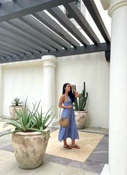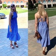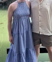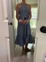 This is a lovely summer dress and I love the back. I found it did slide down a little so I was tugging it up a bit throughout the day despite the ties being tied tight in the back. Still liked it though! Would rent again. Wish they had it in more colors!
