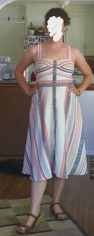 I thought this dress was very flattering. The straps are 2-3" too long and will not stay up. Will have to pin or tape them. Otherwise I love it! A nice thick linen and flattering structure.