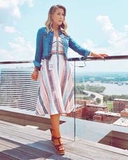Wore this dress to lunch with girlfriends and the trolley museum with our toddler. The length looks great with sandals for daytime wear and with wedges for dinner out. Highly recommend.