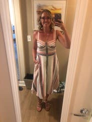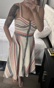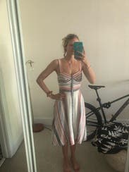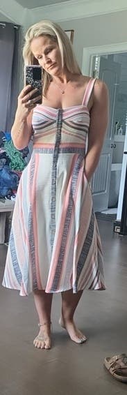I love this dress. Stripes are great, fit is so flattering, fabric is comfortable. The only issue I had was I couldn't find a time to wear it! It feels just a little too fancy for everyday. Wish I had had a party to go to...it would have been a stunner!