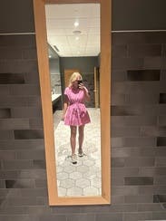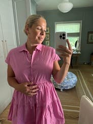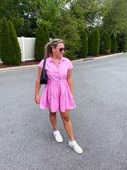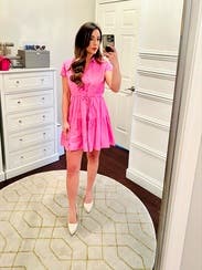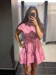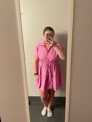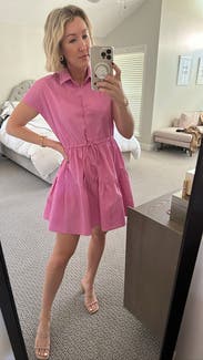 This dress is such a fun bubblegum pink color. It’s made from a really light material making it perfect for spring/summer. The fit is true to size.