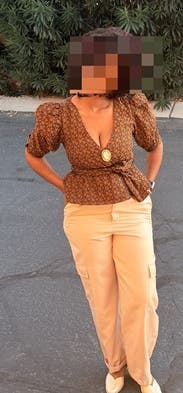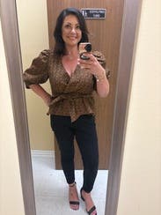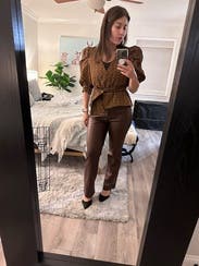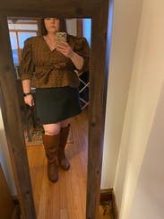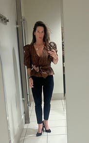 Love the sleeves on this top and it’s super flattering. It is a bit low cut so I had to wear a bralette underneath. I tried fashion tape and that didn’t look right, a safety pin also looked weird too but the bralette was just perfect