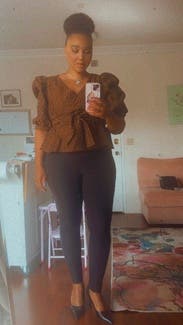 The peplum and length are 👌🏾 The puffiness of the sleeves is my style so I enjoyed them. Pin &/or cami needed for larger cup sizes. Worn to work but could definitely be styled for a semi-casual night out. Worth the 1 time wear.