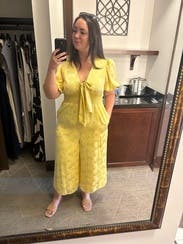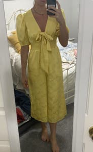 Jumpsuit perfect. I felt so confident, fun and beautiful every time I wore this romper. I’m 5’3” and the length fell closer to the tops of my shoes than a midi length like the photos show. The neckline goes pretty low/wide so I pinned it a bit and tried to use the bow to cover the space. Trickiest thing was tying the bow in the front - I found that it came undone often and my bows got sloppier as the night went on. Word this multiple times - on vacation, at a concert, night out and always received tons of compliments.