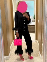 Aside from piles of feathers leaving a trail wherever I went - this set was absolutely perfect to celebrate my Halloween birthday in! SO comfy, super sophisticated, and sexy! I'm barely 5'1" and the top was perfect, and the pants hit me just above the ankle. I wore this with black pumps and of course, a super-fun Halloween birthday hat! RENT THIS!