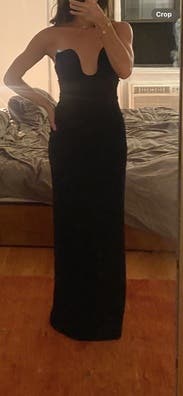I wore this to a company black tie optional/formal event and received compliments all night! I don't normally gravitate toward dresses with bold/plunging necklines and stick to backless or normal strapless cut silhouettes, but this dress made me feel so beautiful! It fit just right everywhere. I'm short (normally 5'2 but 5'5 with the heels I wore), so I used fashion tape to temporarily shorten the hem a couple of inches and it was perfect. If you have a bigger bust, you def will want to use tape to make sure it's held in place. Gloves are from amazon!