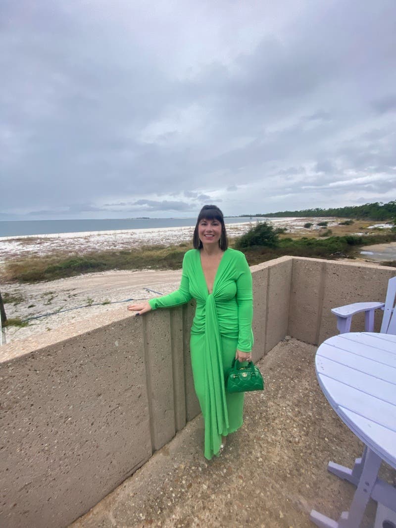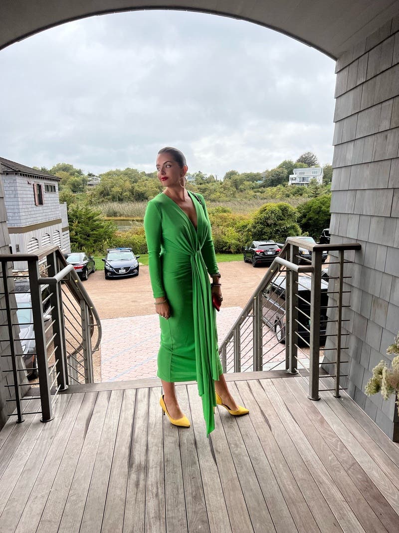 Green jersey (96% Polyester 4% Elastane). Sheath. Long sleeves. Plunge neck. Back zipper closure. 51.5" from shoulder to hemline. Imported.